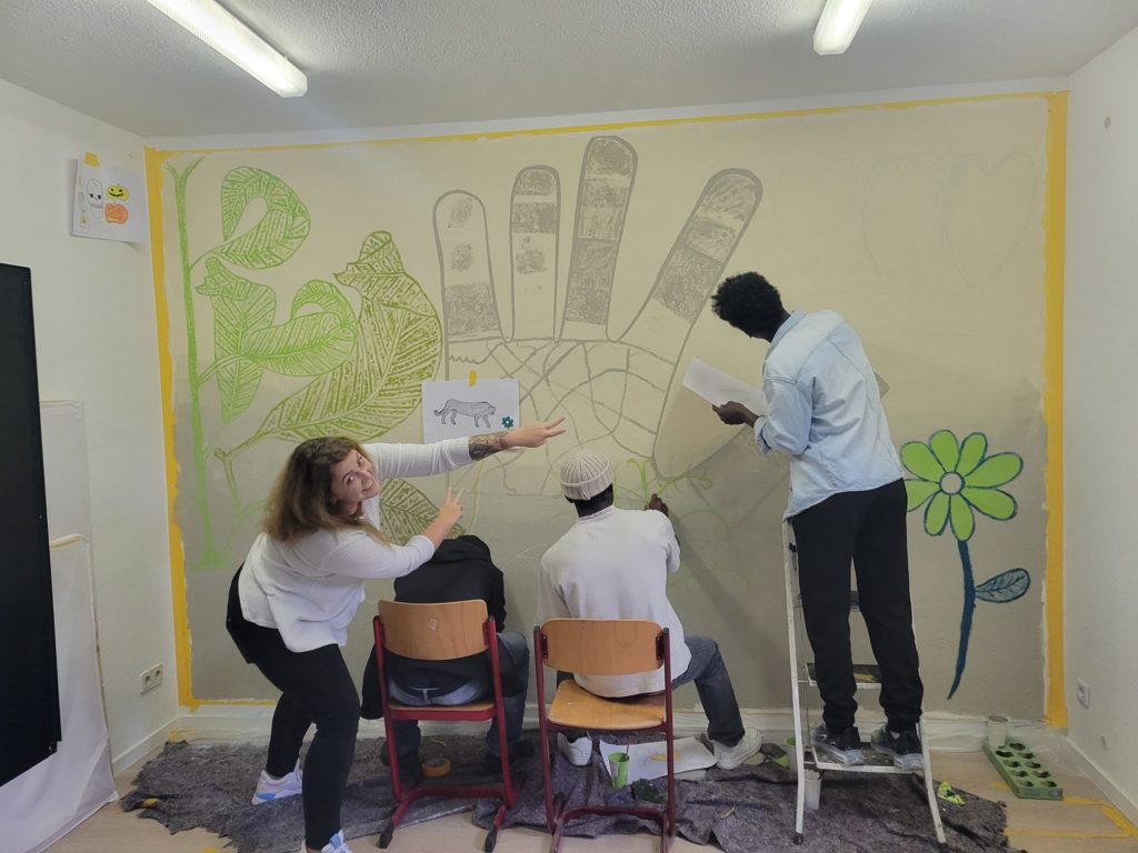 Der Workshop begann mit kreativen Übungen und Skizzen, bei denen die Jugendlichen ihre Ideen und Vorstellungen einbringen konnten. Schritt für Schritt wurden die Entwürfe an die Wände übertragen, Farben ausgewählt und gemischt, Flächen gestaltet und Details ausgearbeitet. Dabei konnten die Jugendlichen ihre gestalterischen Fähigkeiten einbringen und gemeinsam ein sichtbares, bleibendes Kunstwerk schaffen.